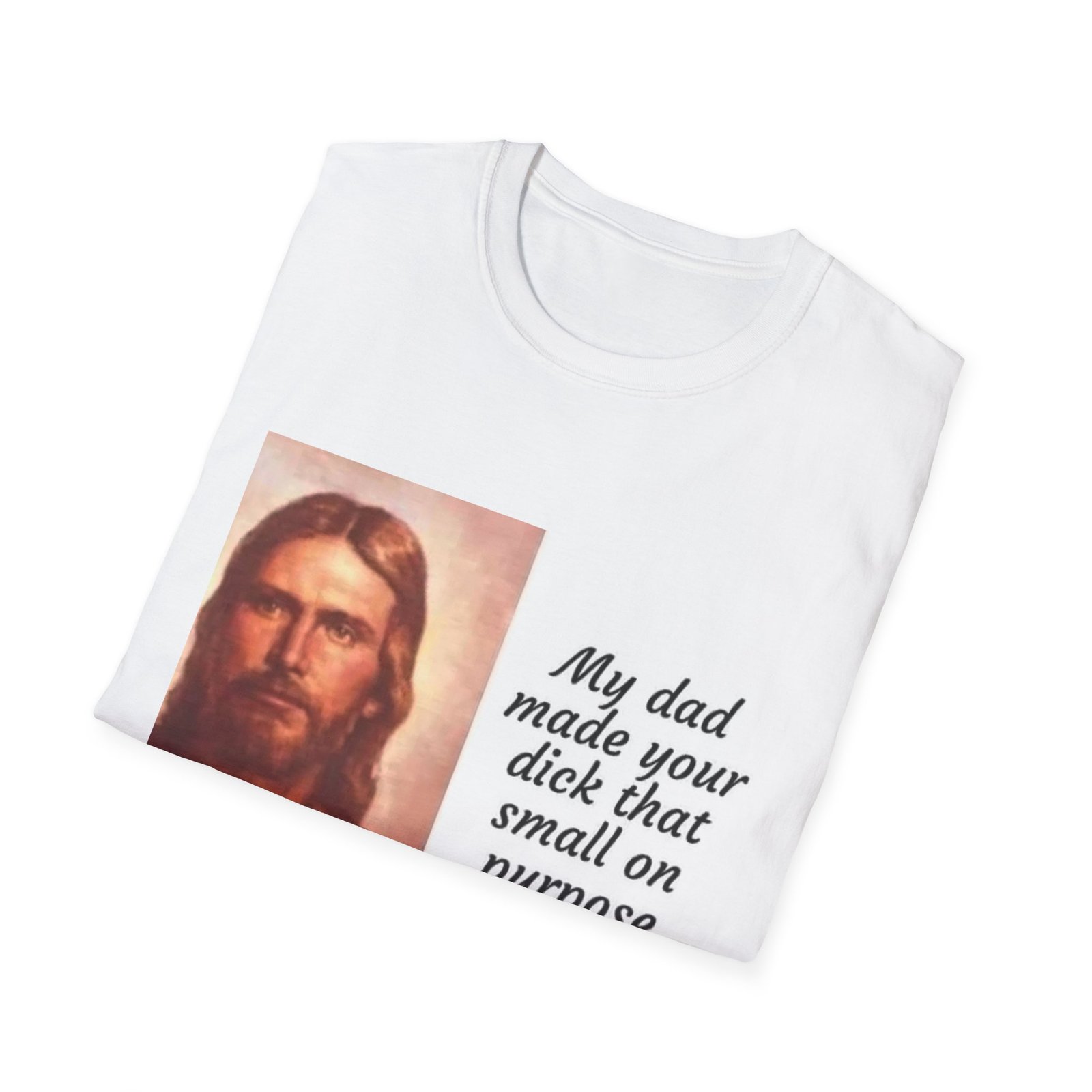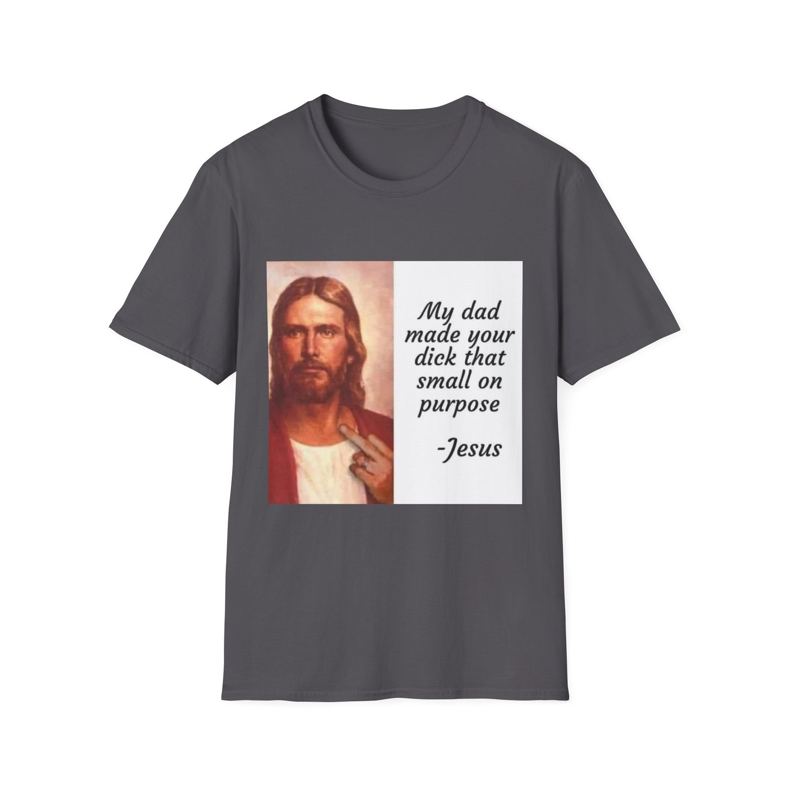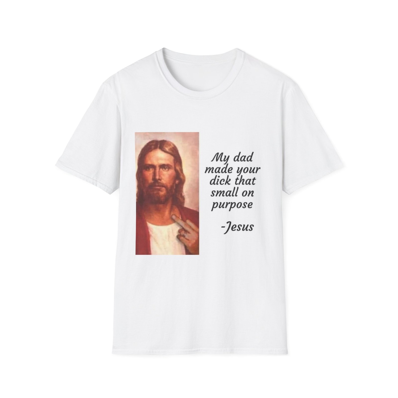A lightweight, soft-feel tee with a bold, irreverent print that speaks to someone who loves edgy humor and isn’t shy about making a statement. The clean crew neckline and classic fit keep the silhouette relaxed and wearable. The front features a vintage-style portrait paired with a cheeky, hand-lettered quote — a design that starts conversations and leans into provocative, playful sarcasm. Wear it layered under a jacket or solo with jeans for a look that’s casual, loud, and unapologetic.