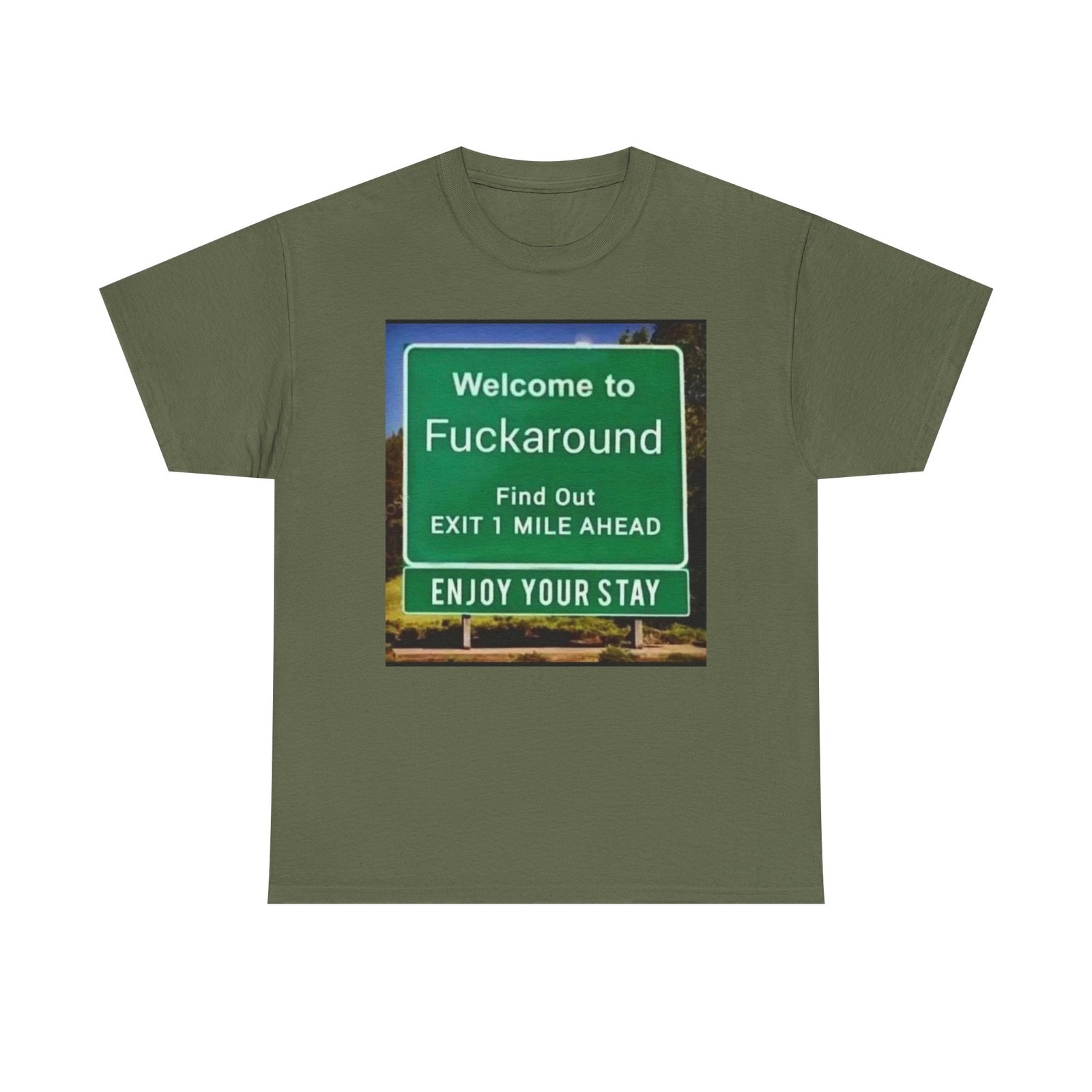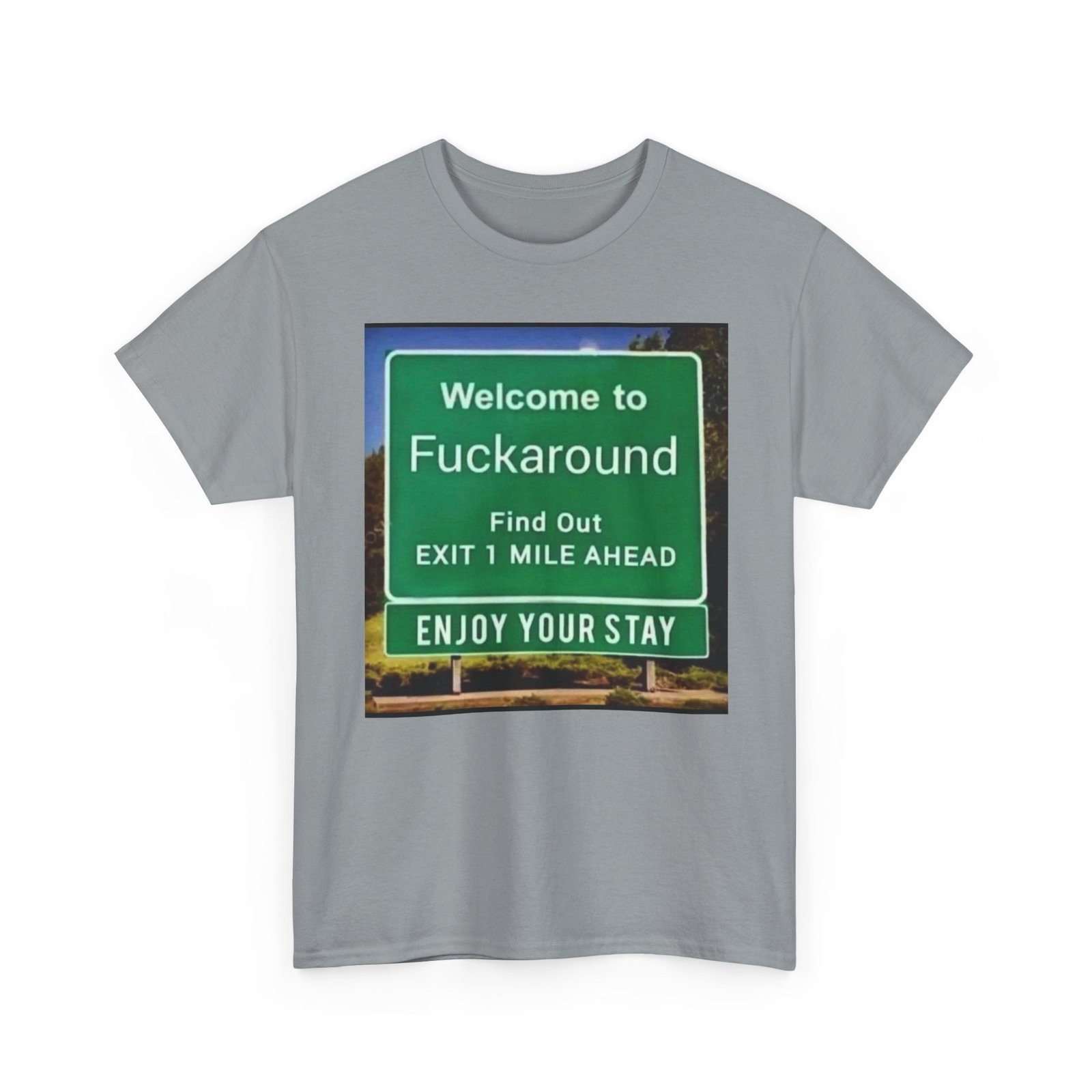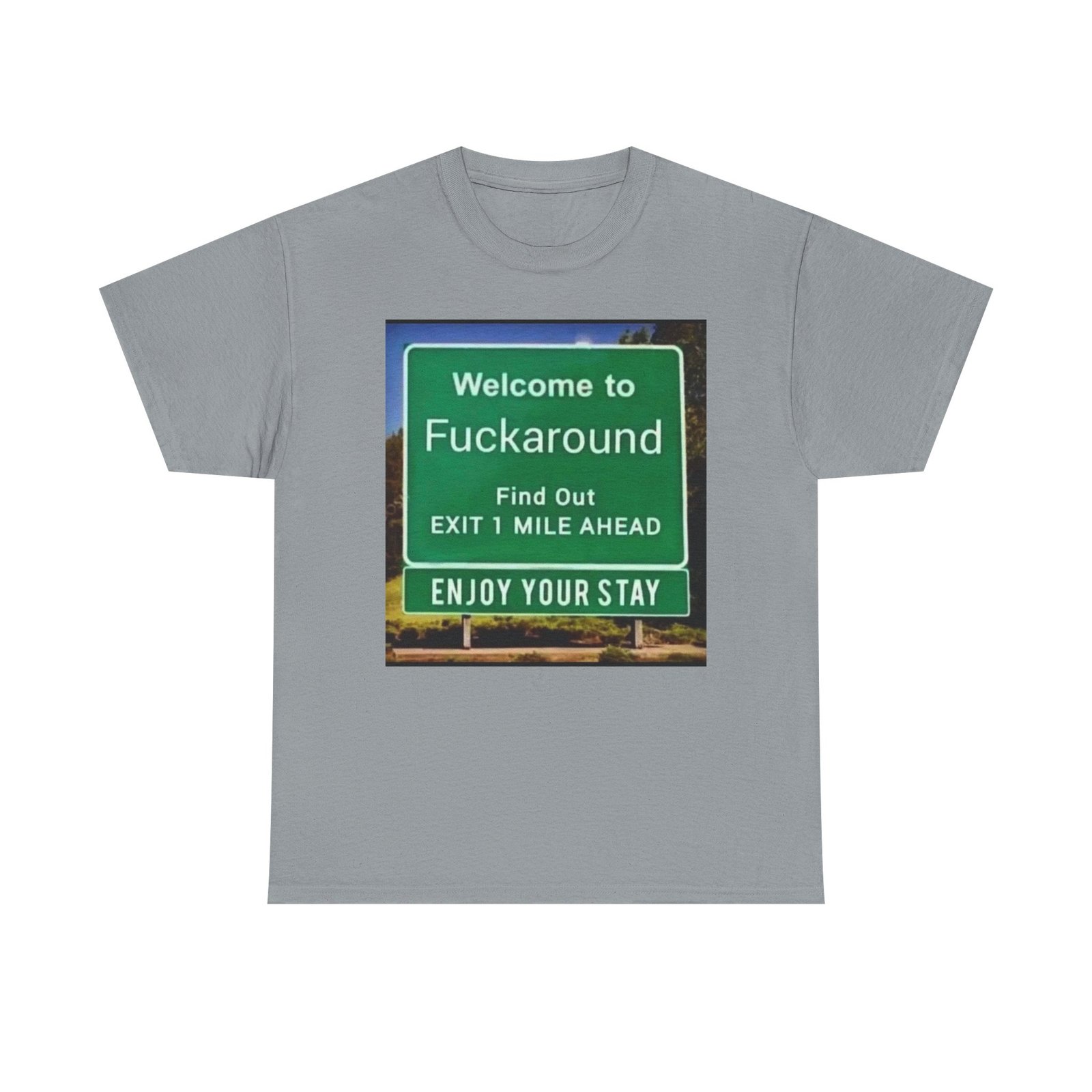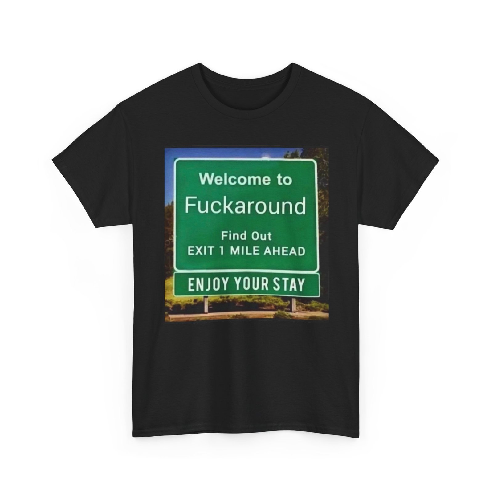 This black classic tee carries a bold, tongue-in-cheek highway-sign graphic that reads like a blunt roadside welcome. It feels like the kind of shirt you throw on when you want to make a clear, humorous statement — a little rough around the edges, unapologetic, and wholly human. The image sits squarely on the chest, colors popping against the deep black fabric to create a faux-roadside vignette that reads from a distance and rewards a closer look. Wear it on late-night drives, at casual meetups with friends who appreciate dark humor, or layered under a jacket when you want a quiet shock of personality. The shirt’s relaxed cut and sturdy cotton give it everyday wearability; the graphic turns everyday into an expression. It feels like the soundtrack of a road trip: sarcastic, free, and a little reckless.