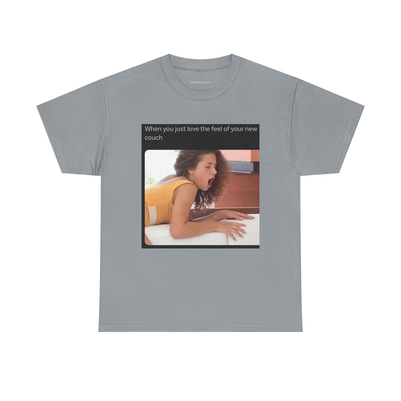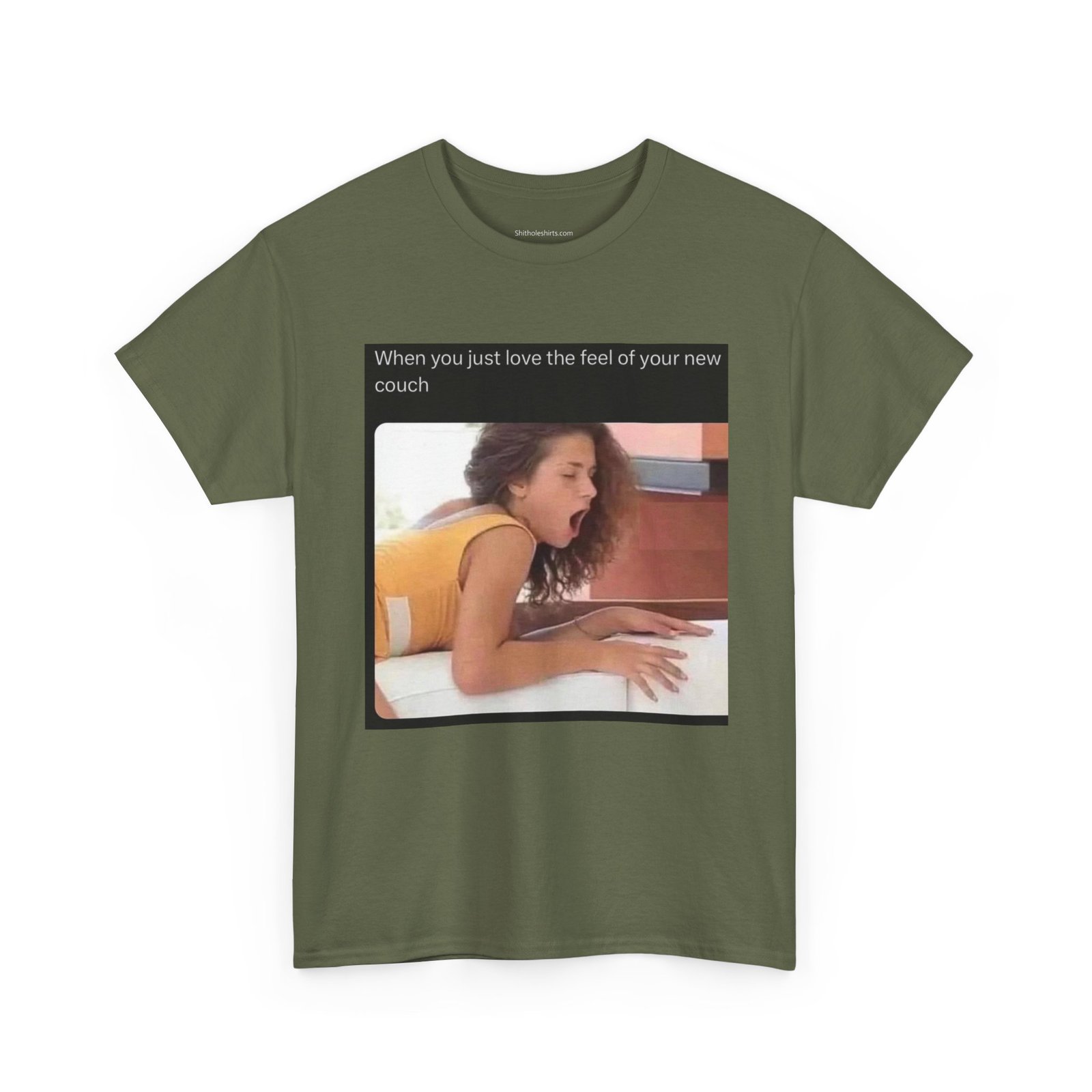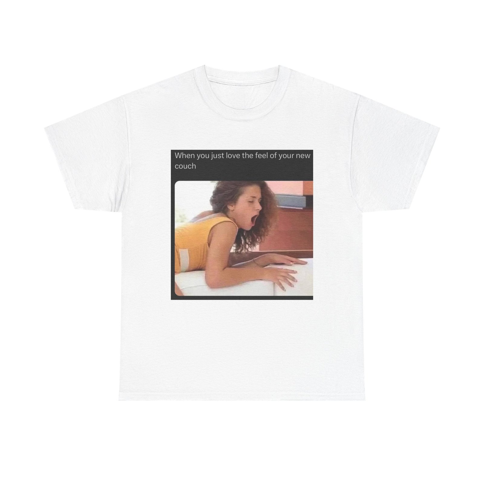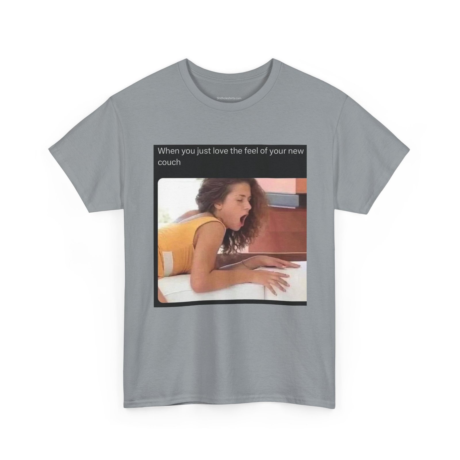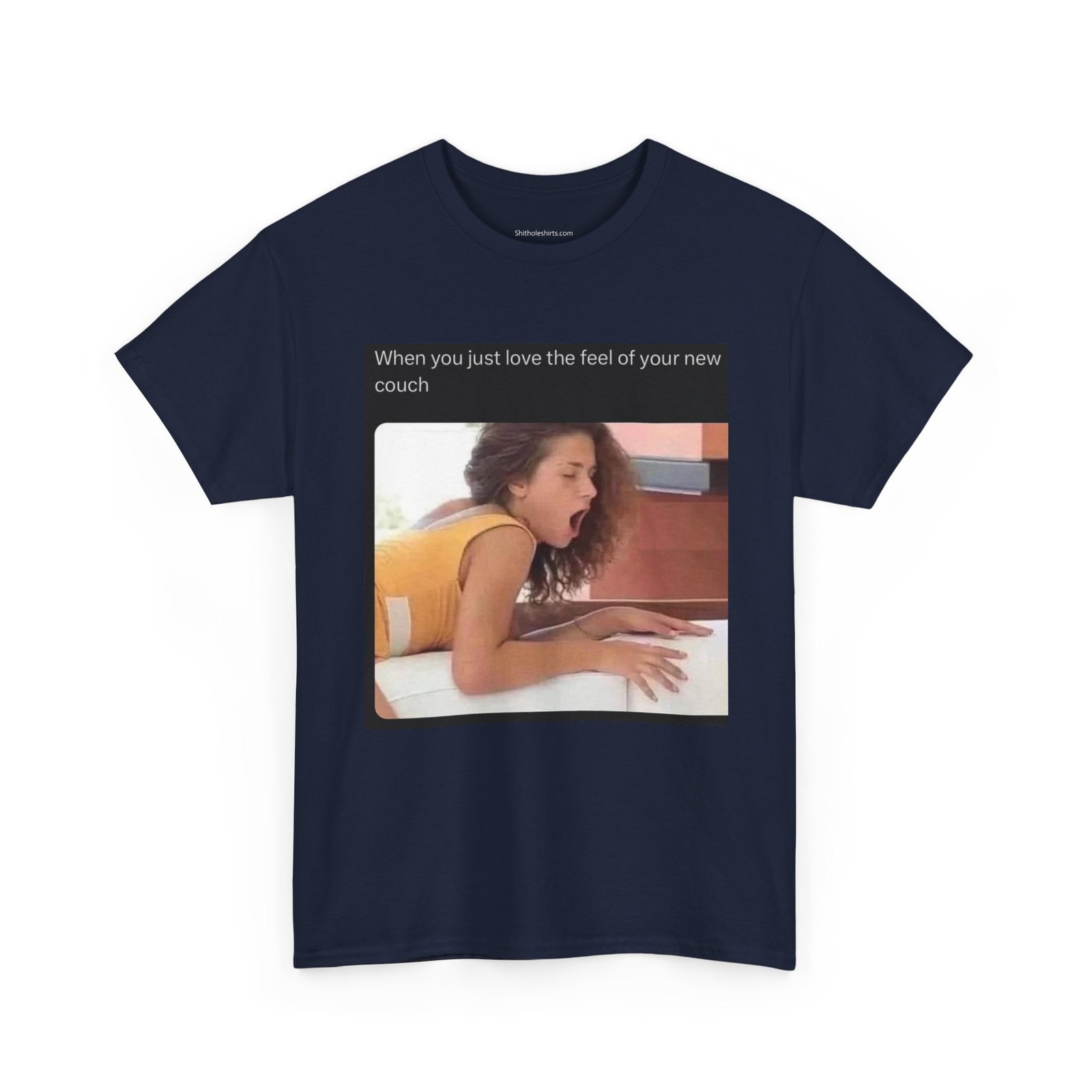 This tee speaks playful, irreverent humor. The image front-and-center reads like a silly snapshot of everyday life—a surprised, delighted reaction paired with a short caption about that fresh-new-couch feeling. It’s lightweight, breathable, and built for repeated wear; the print stays vivid thanks to high-quality DTF/DTG techniques. Wear it to spark laughs at hangouts, weekend errands, or low-key nights in. The crew neckline and classic fit sit comfortably without fuss, while the smooth cotton body keeps the design crisp. It’s the kind of shirt you reach for when you want to be casual, comfortable, and a little cheeky.