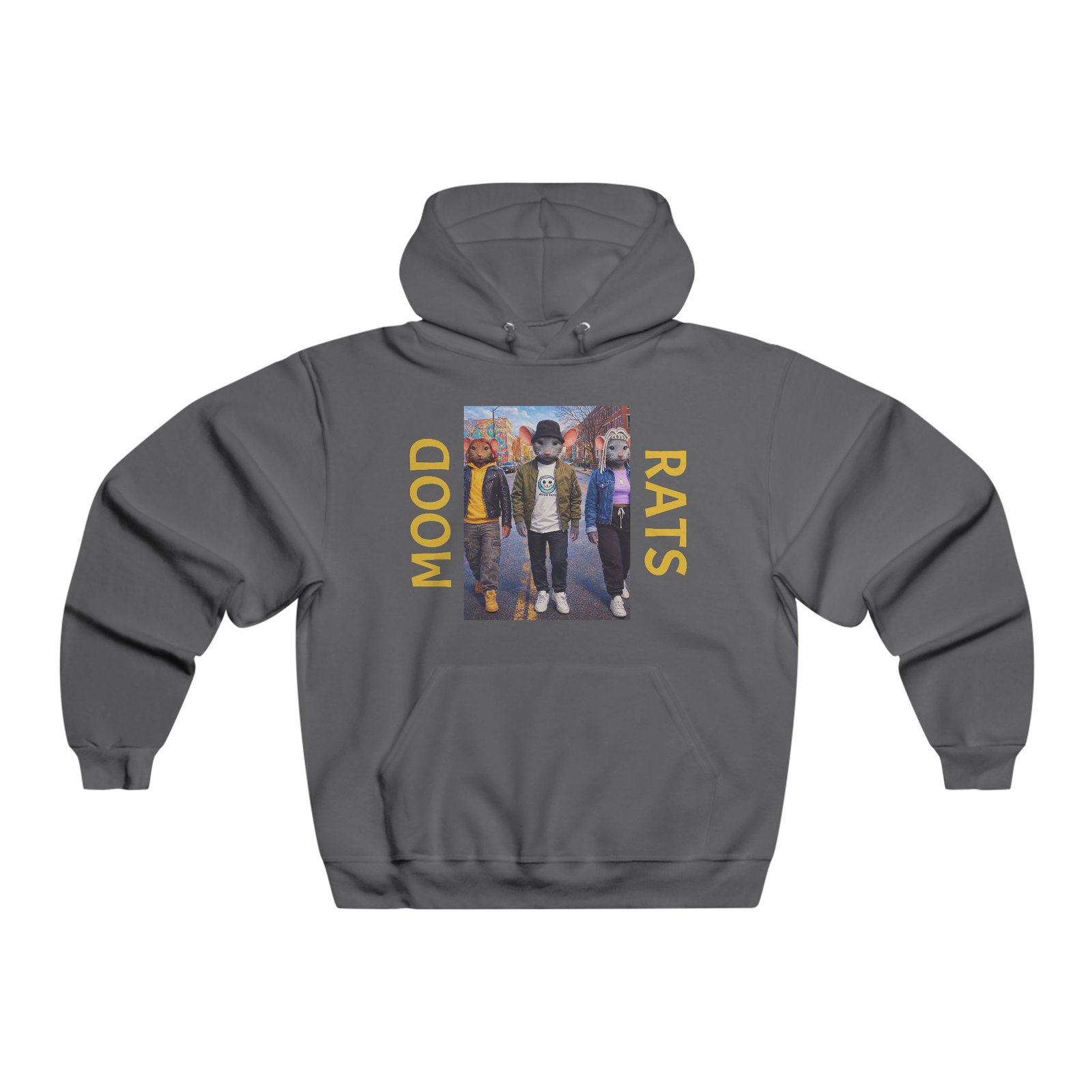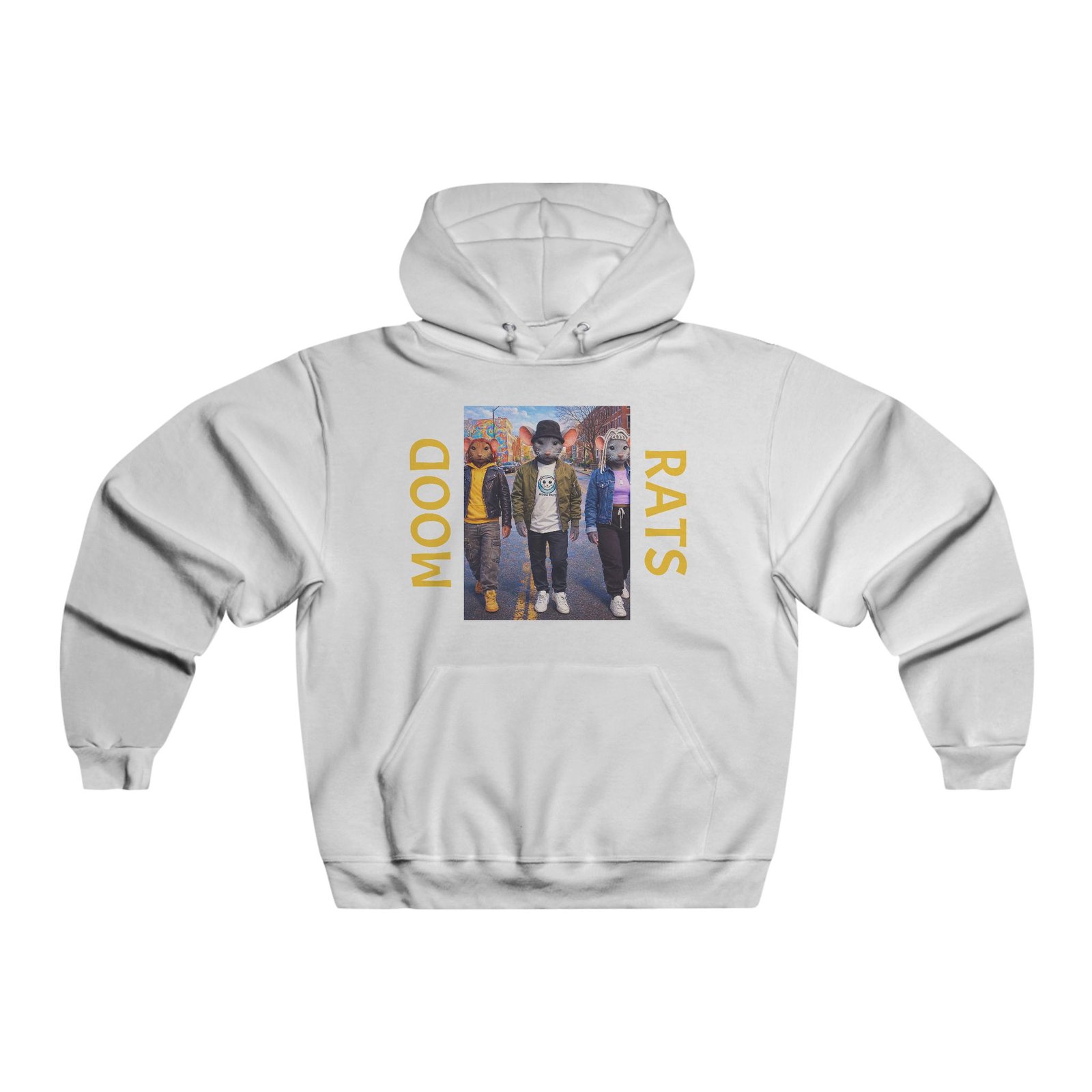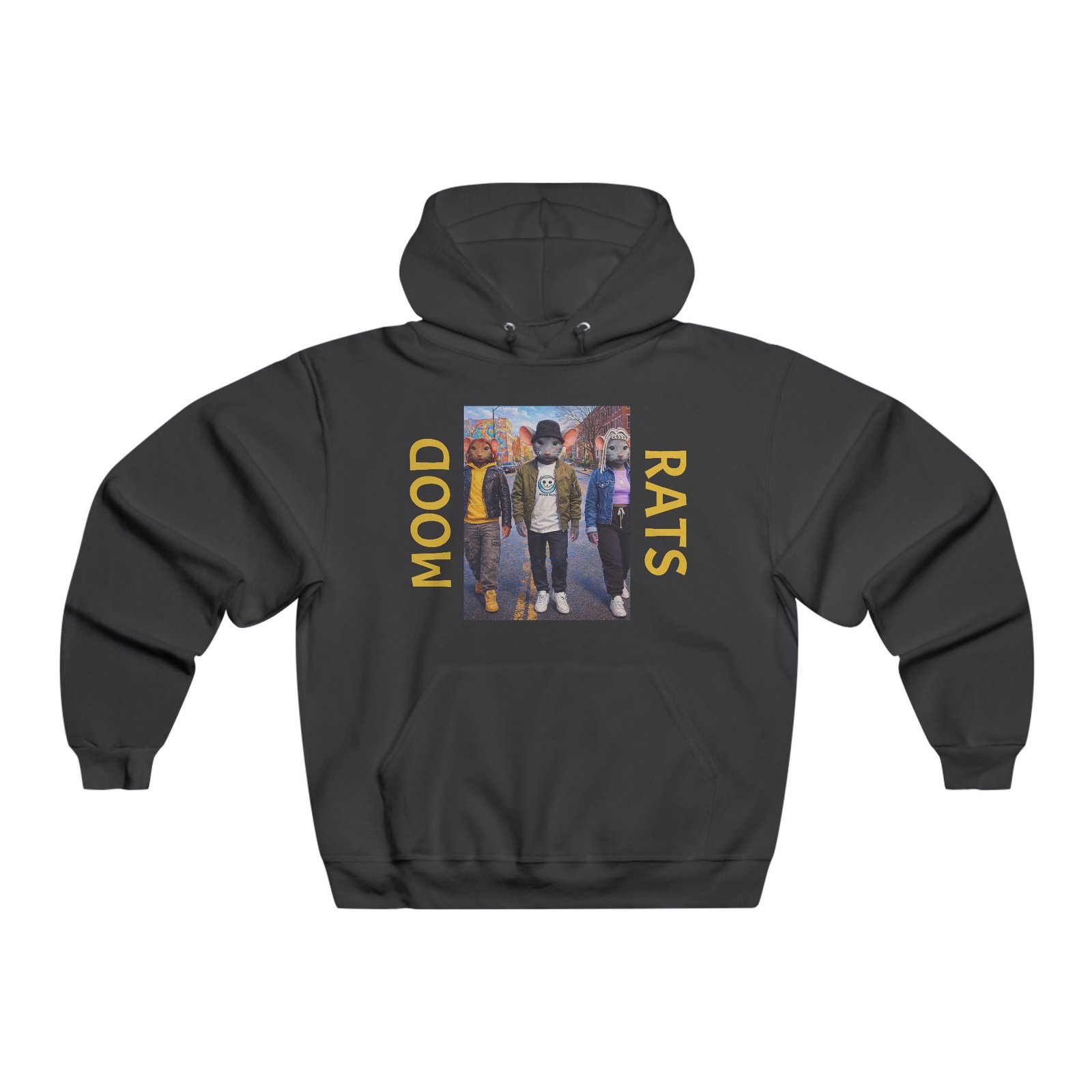 This oversized hoodie carries a gritty, streetwise energy — the central photo-print of three friends framed by bold “MOOD” and “RATS” lettering feels like a snapshot from late-night city walks and underground shows. Thick, soft fabric cups you in warmth without weighing you down. The roomy kangaroo pocket and adjustable hood make it easy to pull on after a cold set or layer over a band tee. Wear it when you want to lean into that lived-in, crew-first vibe — heading to a weekend gig, hanging at a coffee shop, or wandering neon-lit back alleys. The loose cut creates that relaxed silhouette skateboarders, concert-goers, and street-culture fans reach for when comfort and attitude matter equally.