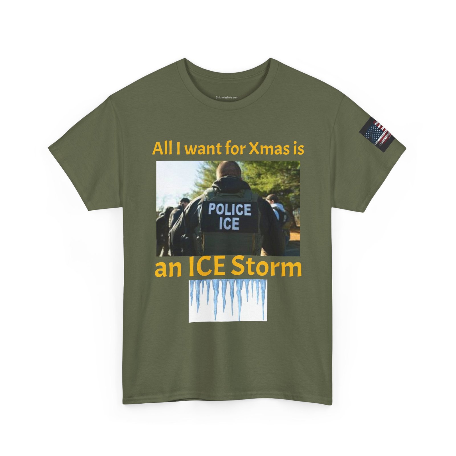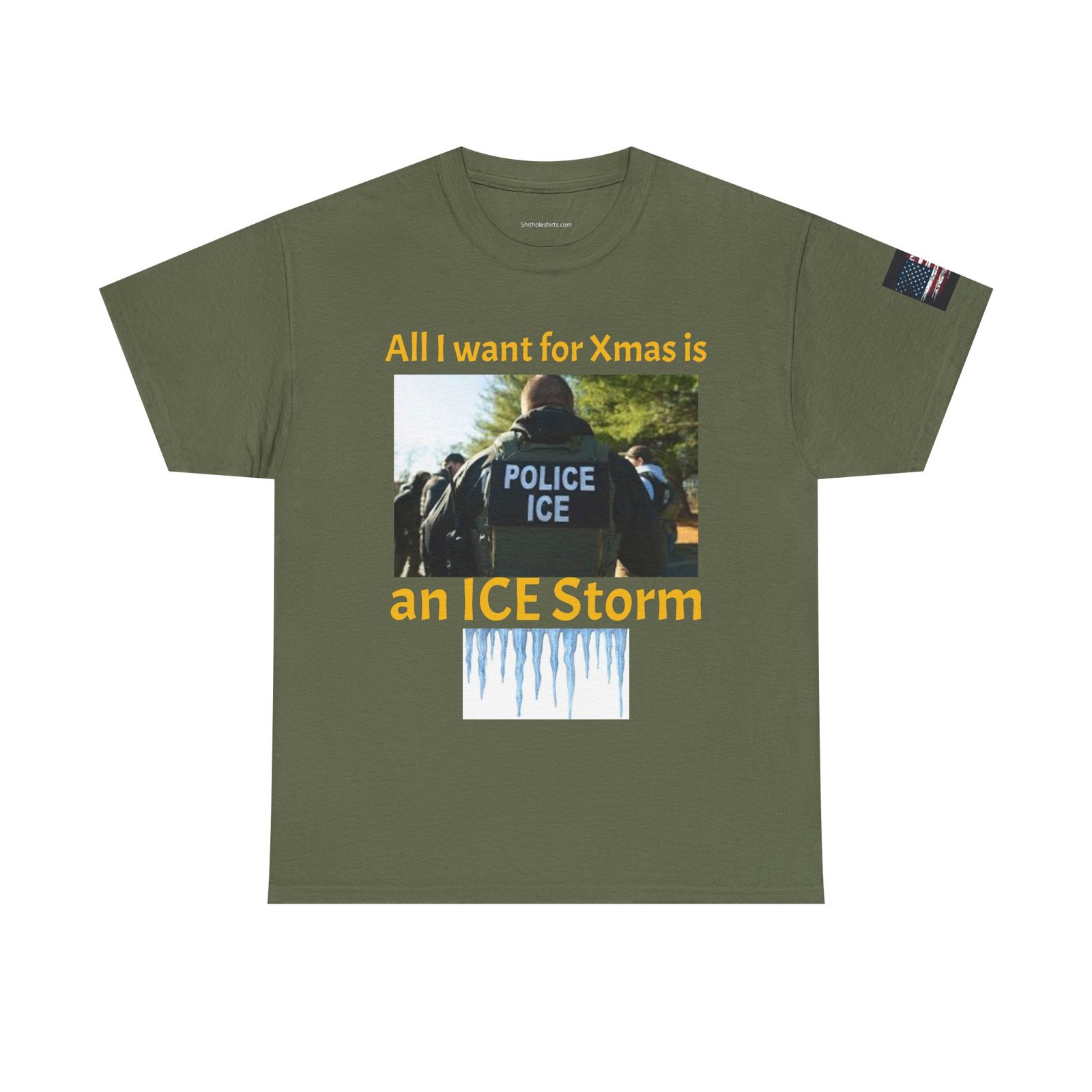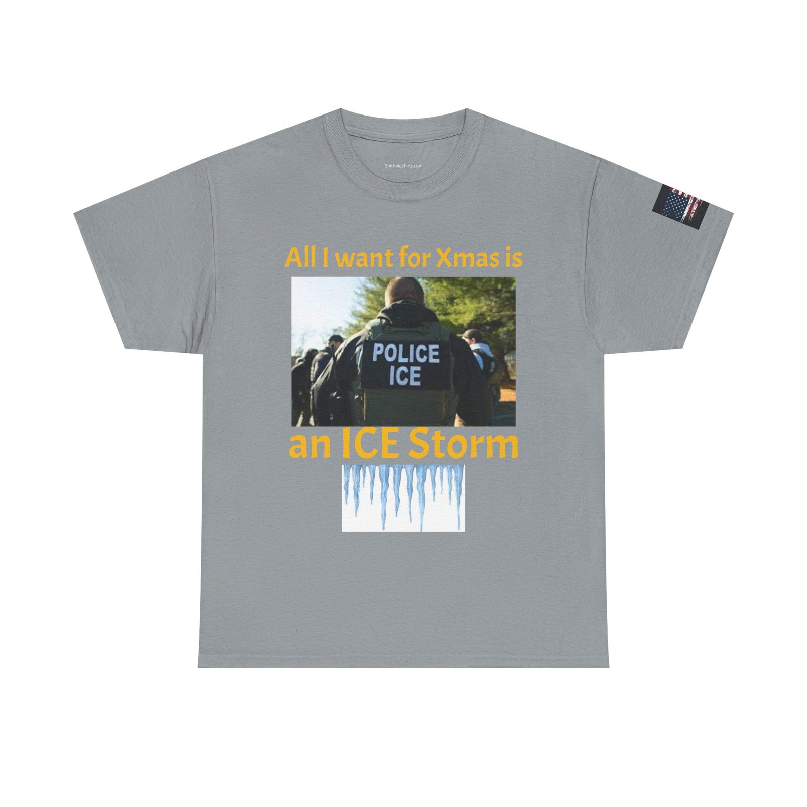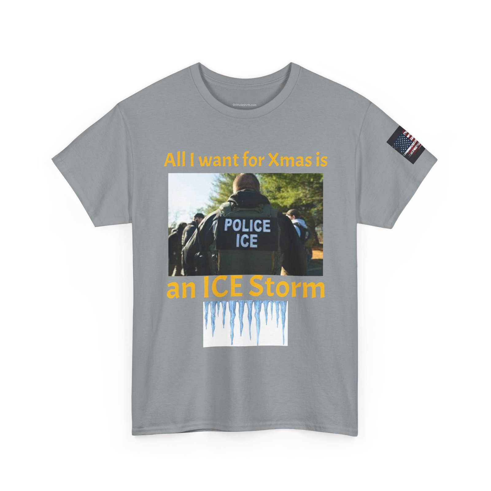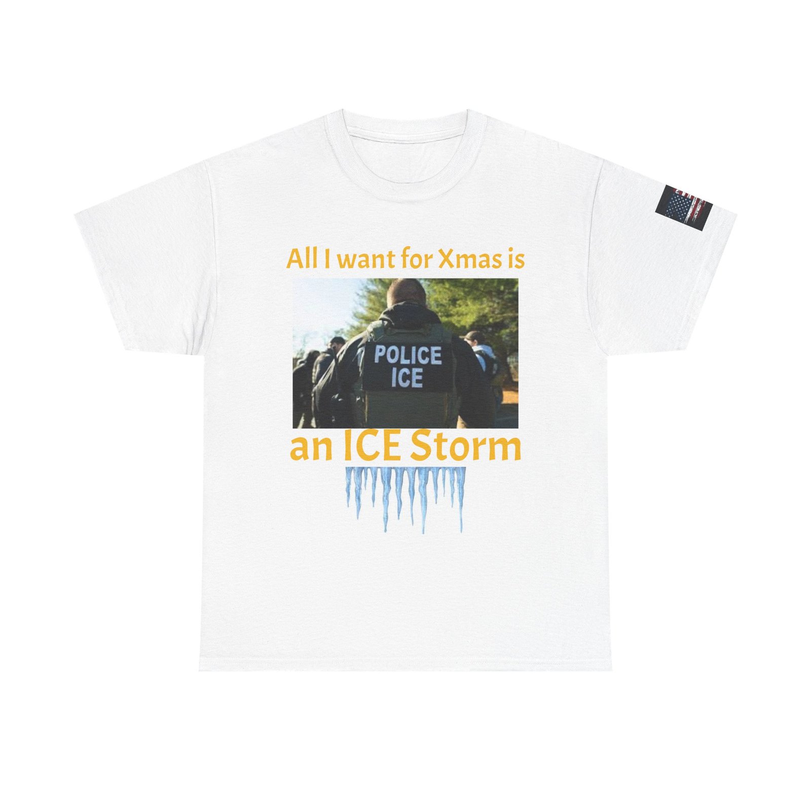 T-shirt that speaks with edge and attitude. A bold photo print of an ICE officer framed by warm gold lettering reads: “All I want for Xmas is an ICE Storm.” Beneath, icy graphic drips echo the phrase and add contrast to the sunlit image. The design sits centered on a crisp white tee and a small printed patch appears on the sleeve, giving the shirt a street-ready, protest-poster vibe. It wears like a lived-in favorite — relaxed, breathable, and built to hold up through washes while keeping the print sharp.