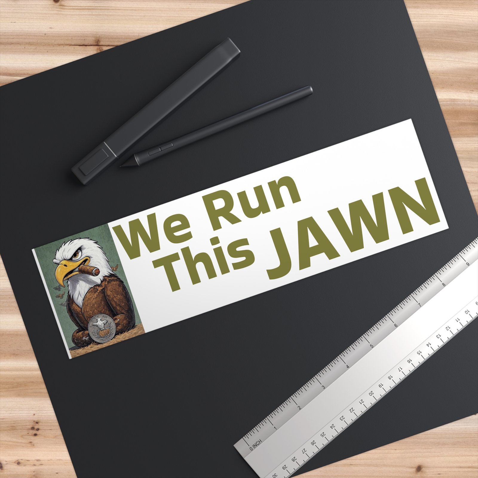 Stick this bold, local-spirited bumper sticker where it will be seen—on your car, truck, cooler, or toolbox. The olive-green block type reads “We Run This JAWN,” paired with a gruff, proud eagle illustration that feels rugged and playful at once. It lands like a neighborhood anthem: confident, a little cheeky, and rooted in regional pride. Weather-ready and matte, it stays low-glare while keeping its bright colors and attitude through rain, sun, and road grit. Slap it on your van for weekend runs, add it to a tailgate setup, or keep it on your daily driver to quietly declare where you belong.